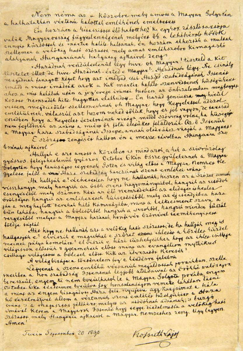 Legyenek a szentemlékű vértanúk megáldottak poraikban, szellemeikben a hon szabadság Istenének legjobb áldásaival az örökké valóságon keresztűl; engem, ki nem borúlhatok le a magyar Golgota porába, engem October 6ka térdeimre borúlva fog hontalanságom remete lakában látni a mint az engem kitagadott Haza felé nyujtva agg karjaimat a hála hő érzelmével áldom a vértanúk szent emlékét hűségükért a Haza iránt, 's a magasztos példáért, melyet az utódóknak adtanak; 's buzgó imával kérem a magyarok Istenét hogy tegye diadalmassá a velőkig ható szózatot, mely Hungária ajkairol a magyar nemzethez zeng. Úgy legyen. Amen!