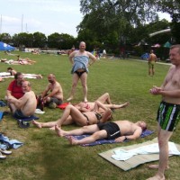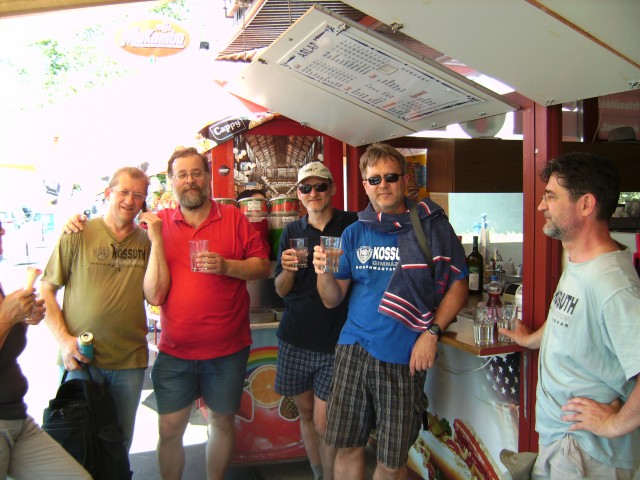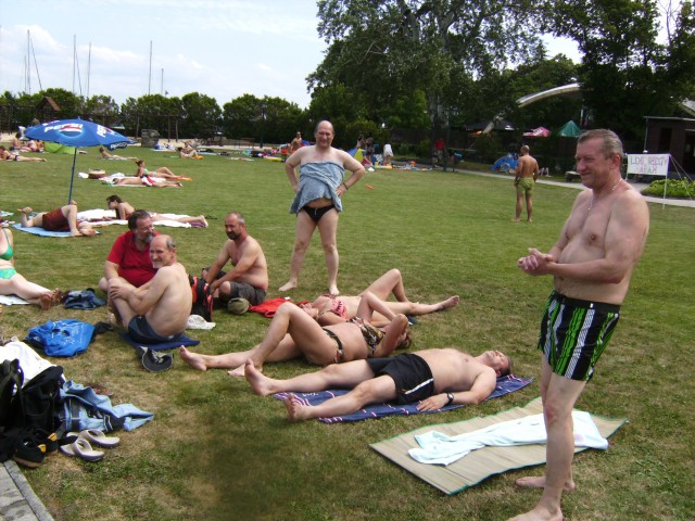 2012. június 22-23-24-én közmegegyezéssel Siófokon találkoztunk. Kegyeibe fogadott bennünket az időjárás, az érkezést követően mehettünk is fürdeni, ami minden alkalommal egybeesett egy néhány kilométeres gyalogtúrával. Az első estét szolíd borozgatással töltöttük. Másnap "közkívánatra" a Sanyi által eltervezett túrára indultunk, persze mindenki ötletét figyelembe véve gyenge kirándulássá átminősítve a programot. Hősiesen felmásztunk a Szamárkőhöz, ami a legenda szerint a gyermek Jézus és az őt szállító szamár lábnyomát őrzi, de igazából a vidéken egyedülálló kő a vulkáni utóműködés idején keletkezett, csak úgy. A zamárdii kilátóból gyönyörű volt a Balaton széltében és hosszában is. Eléggé elcsigázva a melegtől és a gyalogolástól érkeztünk meg a szántódi révbe, ahol Zsuzsát is vártuk már 2. napja, de végre meg is érkezett. A túlparton Eszterék is csatlakoztak hozzánk. Mivel a továbbhaladáshoz gyalogosan már nem voltunk elég fiatalok, dottóval közelítettük meg az Ili által korábban felfedezett tihanyi strandot. Kipróbáltuk az északi part vizét is, majd hajóval tértünk vissza Siófokra. Megjöttek Tiborék és Canti is (sajnos csak kis időre, de annak is nagyon örültünk!) Attila hagyományos és fenséges grill kajája után jó kis buli kerekedett, de 4 után már gyorsan lefeküdtünk, mert van, aki nem tud elaludni világosban. Vasárnap délelőtt még nagyokat fürödtünk, megettük a maradékot és lassan hazaszállingóztunk, megállapítva, hogy ismét jó volt együtt!
